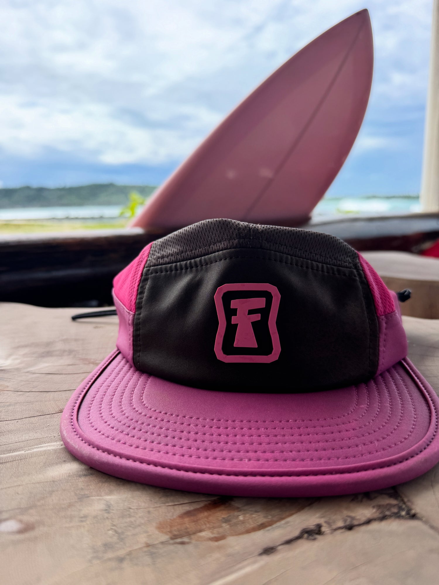 Cherry Choc - 5 panel surf cap with removable chin strap